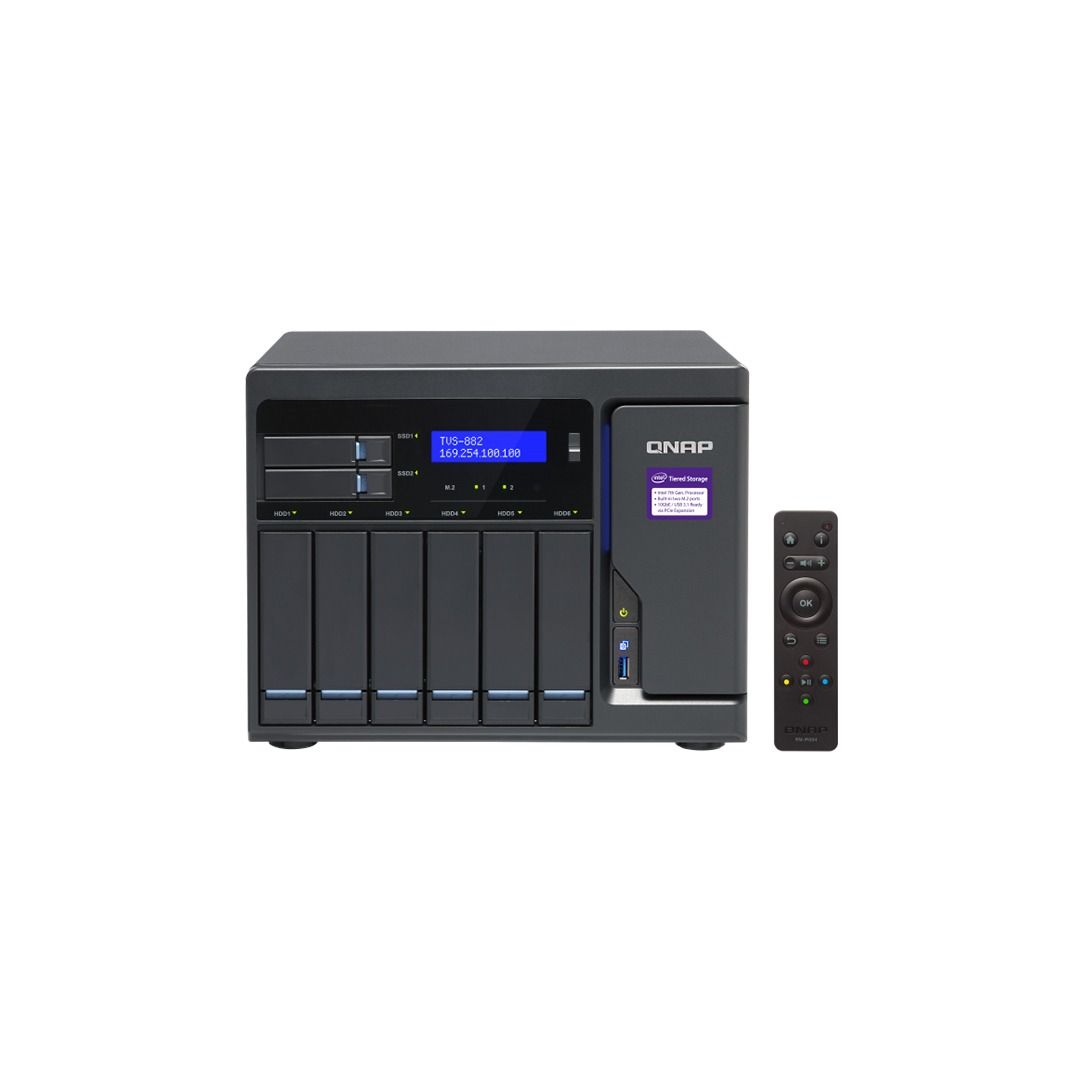 ذخیره ساز NAS کیونپ مدل TVS-882-I3-8G دارای 8 عدد سینی نصب هارد است و میتواند 6 عدد هارد 3.5 اینچی و 2 عدد هارد 2.5 اینچی را درون خود جای دهد. در این ذخیرهساز شاهد استفاده از پردازنده اینتل و 8 گیگابایت رم هستیم. این میزان رم با استفاده از 4 اسلات SODIMM تا 64 گیگابایت قابل ارتقا است. 3 عدد خروجی HDMI اجازه پخش روان ویدئوهای 4K را به TVS-882-i3-8G میدهد و با وجود خروجی صدا و اسپیکر داخلی میتوانید از این محصول به شکل کاملا مستقل استفاده کنید. وجود ریموت کنترل هم اجازه میدهد بتوانید به سادگی کنترل ذخیرهساز و پخش تصویر را بر عهده داشته باشید. در ذخیره ساز NAS کیونپ مدل TVS-882-I3-8G از دو عدد پورت SFP با سرعت 10 گیگابیت بر ثانیه و دو پورت LAN گیگابیتی استفاده شده است. با استفاده از این پورتها کارهایی از قبیل بکاپ گیری و بازیابی اطلاعات به سرعت انجام خواهد شد. سیستم عامل این ذخیرهساز، QTS است و در آن امکان اتصال به سرویسهای ذخیرهسازی ابری هم فراهم شده است. کیونپ یک فروشگاه نرمافزاری با نام App Center را هم روی این محصول فعال کرده که میتوانید برنامههای برای مدیریت محتوا، ارتباطات، دانلود، بکآپ و سینک کردن روی آن پیدا کنید.